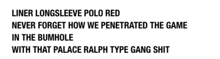 Palace on the other hand started off as a small London streetwear brand which was popular with skateboarders and other streetwear enthusiasts. Completely the opposite to Ralph Lauren in the fact that Palace targeted the underground culture of Skating and certain types of music as well as the street culture of London at the time. Palace's clothing is nice but their clothing descriptions could be even better: